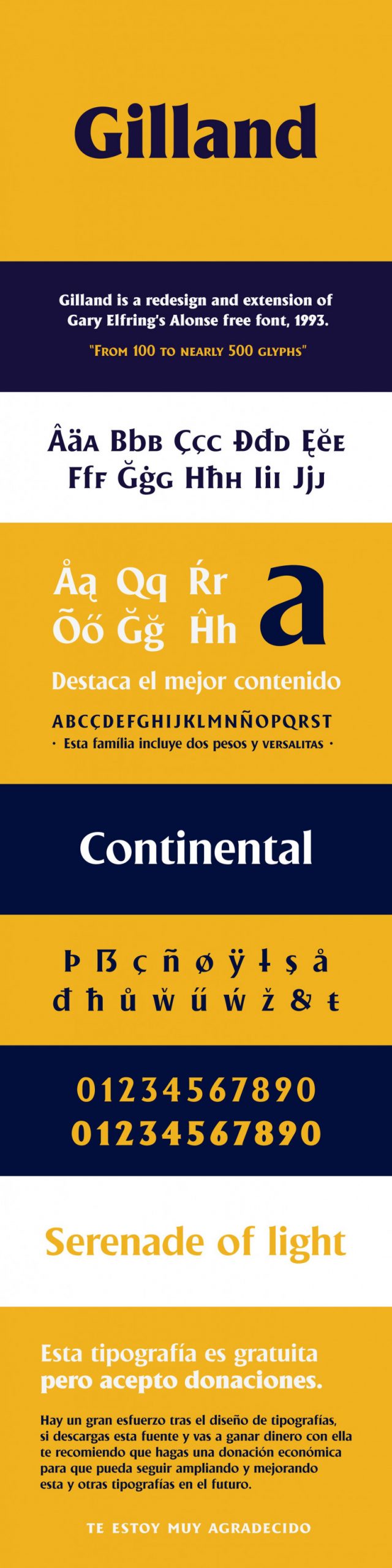 A modern, quirky and decorative serif typeface. Made from font designer named Andreu Gallart Ruiviejo. It can be classified as an Incisa (for the endings) with ancient Roman airs (for stroke modulation), but of grotesque proportions (by the height of x). Gilland contains 480 glyphs, including symbols, diacritics, new characters, kerning pairs, small caps. This type can work for texts, headlines, logos, corporate images and more.